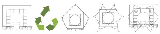 The original measurements of the canopy were a 33 × 33 m steel truss structure with an accessible area inside, with 22 columns. The architectural concept of the new canopy design was inspired by the up-cycling logo, which stands for reuse rather than recycling. The canopy was modeled after an outline of the logo, and the final shape was achieved by exploiting the NURBS curve control points (Figure 3).