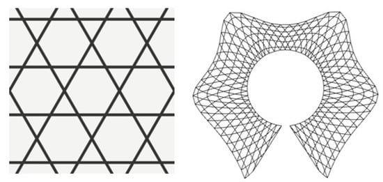 To address this issue, two approaches can be considered: first, changing the continuous shell to a grid shell, and second, changing the design approach. To achieve this goal, we first decided to switch from a continuous shell to a lattice shell, which combines the aesthetic of form with the performance of a structure driven by the construction simplicity and material economy of straight lath members that can be bent into shape. As a result, a Kagome lattice (Aniso grid) [,] made up of triangles and hexagons was chosen to project on the free-form surface generated by the evolutionary solver (Figure 7). The lattice structural grid was developed using the Lunch Box plugin in Grasshopper. The Lunch Box plugin in Grasshopper was used to create the lattice structural grid. A free-form surface is paneled with hexagonal cells in this process. It generates a flat list of hex cells, and by connecting the midpoints of the hexagon sides, we obtain a Kagome lattice grid.