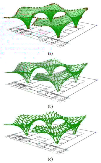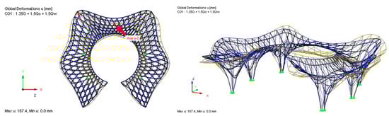 The model was exported to RFEM to perform the FE analysis and evaluate the performance, with a hot-finished Steel S 355 circular pipe of 100 mm diameter and 10 mm thickness, Young’s modulus E = 210,000 MPa, and a load of 1 kN applied to all intersecting nodes of the grid structure in the negative z direction. The foot nodes of the columns were assigned nodal support, with six nodal supports at each supporting system. A 2 mm thick tensile membrane (Polytetrafluoroethylene) fabric sheet was chosen to stretch over the lattice grid as a cover for the roof structure (Figure 11).