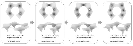 Finding the optimal shape for a canopy for desired or required constraints and goals in the form-finding procedure described above is essentially an optimization process, usually followed by trial and error. The structural grid went through several stages before reaching its final form. The grid meets the ground with four support systems in the early scheme, which was structurally unstable and unsatisfactory, leading to six support systems after many iterations and progressive changes in the number of support systems and the geometry’s shape (Figure 10).
