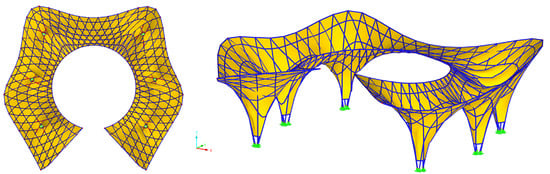 The historical developments of shape-resistant structures are demonstrated by the works of Antoni Gaudi, Sergio Musmeci, Heinz Isler, Pier Luigi Nervi, and Frei Otto [,], as well as research on physical models and the structural optimization of complex structures such as membranes, shells, and grid shells [,]. It is indeed possible to design novel structural systems that are structurally more effective by taking advantage of structural optimization and incorporating numerical simulations into a conceptual design [,]. Parametric structural design is the emerging research field that tries to bridge the gaps between current computational paradigms and enable true structural inputs into the conceptual design [,]. We may now create unprecedented levels of spatial and morphological complexity because of the development of computational tools and the associated formal-spatial repertoire []. Recent studies on the advantages of bio-inspired forms have already been linked with computational form-finding methods, it emphasizes the potential structural benefits of redundancy and differentiation, in addition to their ability to perform multiple functions at the same time [,]. Physical models have steadily been substituted in recent decades by algorithm-aided design because of the substantial advancements in Computer-Aided Design (CAD) and virtual modeling technologies, which enable more complicated, accurate analysis and computations [,]. The design problem can be approached using computationally developed techniques that pay close attention to both behaviorial requirements, architectural, and formal aspects. By using these techniques as design tools, they replace the physical models of earlier times with computational analysis, establishing a logical relationship between the architectural morphology and its structural stability [,,].