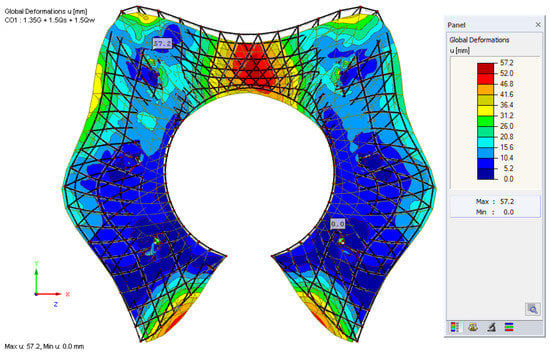 Once all material properties, supports and loads are defined, the model is ready to analyze. RFEM, FE solver calculations are based on second-order analysis as our structural model is nonlinear, and RFEM automatically decides the required number of load increments according to a heuristic method. The calculation included wind load cases and snow load cases, in addition to the self-weight, and the load situations were provided by the Dlubal software online GEO-ZONE tool. The structural analysis of beam members and the tensile surface was performed by the FE solver, and results were obtained with a maximum displacement of 167.4 mm for beams (Figure 12) and 57.2 mm for surfaces (Figure 13).