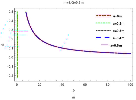 For fixed values of mass m and charge Q, and varying the values of bounce parameter a, Figure 1 depicts the graph of deflection angle vs impact parameter b. For , we investigate that at the small values of impact parameter b, one can obtain the maximum value of the bending angle . A the value of b increases, the bending angle exponentially decreases and approaches zero. It is observed that for the small values of b, one can obtain the positive angle (deflection in the upward direction). Further, we examine that the bending angle shows the inverse relationship with the impact parameter b. Moreover, physically the bending angle represents the stable behavior.