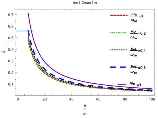 The above deflection angle depends on the mass m, charge Q, bounce parameter a, impact parameter b and the plasma parameters i.e., and . The terms without the bounce parameter a and which contain charge are due to the charged nature of the BH. The remaining terms are due to the corrections with the bounce parameter a. For , one can find the bending angle of a Reissner–Nordström BH in a plasma medium. By neglecting the charge and bounce parameter, the obtained angle reduces to the bending angle of the Schwarzschild BH. We also observe that the effect of the plasma increases the deflection angle. The bending angle is inversely proportional to the photon frequency, so the bending angle increase by lowering the photon frequency and assuming the electron frequency is fixed. Moreover, one can attain the bending angle in the case of non-plasma medium [74] if we take or in the derived deflection angle in Equation (15). We also observe that the obtained deflection angle Equation (15) is directly proportional to the mass m, charge Q, bounce parameter a, and inversely proportional to the impact parameter b.