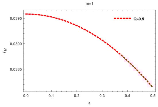 One can observe that the obtained expression of the Hawking temperature black bounce Reissner–Nordström BH depends on the mass m, charge Q of the BH, and bounce parameter a similarly with [71]. We also notice that the Hawking temperature via standard technique gives the same expression as the topological technique. For the case and , the obtained Hawking temperature in Equation (21) reduces to the Hawking temperature of Reissner–Nordström BH. Moreover, the attained Hawking temperature Equation (21) reduces to the Schwarzschild–Hawking temperature, i.e., by taking . To observe the behavior of Hawking temperature graphically, we plot the graph between Hawking temperature and bounce parameter a in Figure 4. We observe that for the Hawking temperature decreases exponentially.