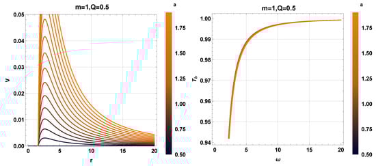 In the metric function, m stands for the mass of the BH, Q indicates the charge, and a represents the bounce parameter of black bounce Reissner–Nordström. Several characteristics of the black bounce family have been thoroughly investigated [75,76]. Some properties are that the curvature singularities are absent from the black bounce family on a global scale and satisfy all observable weak field tests. Based on the values of charge Q and bounce parameter a, one can easily interpolate the Reissner–Nordström and Schwarzschild BHs. By taking charge and bounce parameter , one can obtain the Reissner–Nordström BH. If we consider the charge and bounce parameter , then we can obtain the Schwarzschild BH. The event horizon of the Reissner–Nordström BH corrected by bounce parameter can be computed by taking .