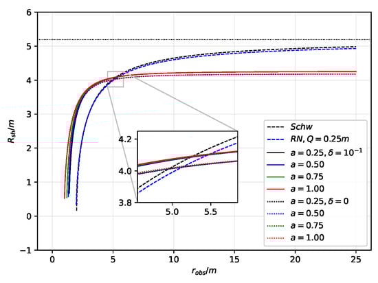 Next, we plotted Equation (40), which is indicated by the dotted lines in Figure 7. We also included in the plot the case where the black hole bounce is surrounded by plasma (solid lines). For immediate comparison, we also plotted the Schwarzschild and RN cases.