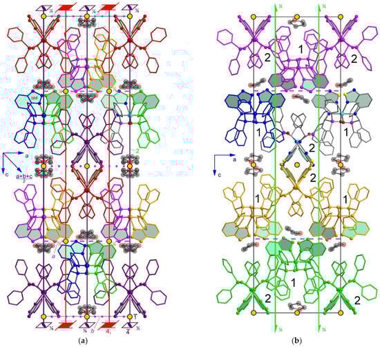 A fragment of crystal packing of compounds: (a) 1·THF and (b) 2·THF (in P1121/a setting; the numbers denote the first and the second independent molecule) showing the symmetry operations. Colour scheme: blue—translation, yellow—inversion, magenta—glide plane, green—2-fold axis (rotation or screw), red—41 axis, violet—(–4) axis. Crystallographically independent moiety is shown in grey, and symmetry-related moieties are coloured with the corresponding symmetry colour scheme. Hydrogen atoms are omitted and solvate THF molecules are shown as transparent spheres (without colours of symmetry relations).