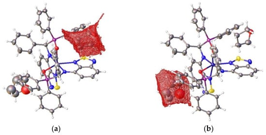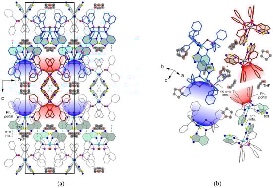 All the compounds reveal π–π interactions between the benzothiadiazole (btd) moieties of neighbouring molecules, which possess a similar relative arrangement owing to the similar molecular shape. In 1·THF and 2·THF, these btd–btd junctions with the local inversion symmetry compose complexes in chains spreading along two mutually perpendicular directions. Such π–π interactions with a head-to-tail arrangement of aromatic moieties are quite typical for nitrogen-containing heterocyclic derivatives [46]. In 2·2THF, the junctions connect complexes in insular pairs. Outside the pair, the π–π interaction is prevented by the presence of one of the THF molecules between the btd moieties. Another crystallographically independent THF molecule in 2·2THF and the molecule in 1·THF and 2·THF are arranged in a different manner with respect to the complexes. In 1·THF and 2·THF, the THF molecule is arranged above a Ph4 portal of the complex composed of four phenyl groups of C(Ph) and P(Ph) moieties (Figure 3a). In 2·2THF, the THF molecule is located outside the portal that is pointed to a portal of the neighbouring complex (Figure 3b).