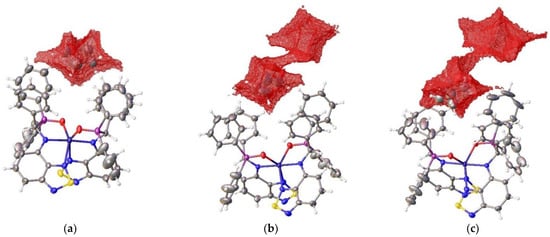 In the case of compound 1·THF, we cannot explicitly locate the position of the solvate THF molecule, i.e., distinguish oxygen atoms among the carbons in THF (type 1 disorder; Figure 4a), since it shows a disorder (type 2) due to the proximity to the two-fold axis. In fact, the residual electron density map indicates a type 2 disorder of the whole molecule over more than two positions; however, only two of them appear as major equivalent positions, which are discussed hereafter. Puckering analysis of the THF [47] was not carried out due to the somewhat low quality of the XRD data and the disorder. We analysed intermolecular distances between atoms of the THF and its neighbouring complexes in the crystal of 1·THF. Visualization of the THF environment using the Hirshfeld surface technique revealed that one of the non-H atoms of the THF shows contact with the complex slightly shorter than the sum of van der Waals radii (Figure 4b). We assign this atom as the oxygen since otherwise, hydrogens of CH2 moiety of the THF would conflict with the (C)H hydrogen of the complex (the estimated H···H distances of 1.46 Å are unreasonably short). Thus, the THF possesses type 2 disorder (due to the proximity to the two-fold axis), but it does not possess type 1 disorder.