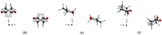 For the lower-symmetry compound 2·THF, the solvate molecules show less disorder owing to the absence of the special position next to them. One of two crystallographically independent molecules (THF1) is well localized, while another (THF2) shows type 2 disorder. The analysis of intermolecular distances allowed us to unambiguously determine the position of the O atom for both solvate molecules, i.e., to exclude a type 1 disorder, similar to that in 1·THF. For a comparative analysis of the molecular environment of the THF molecules, we analysed the cavities filled by them. In the absence of THF, structure 1·THF reveals a void of ca. 160 Å3, which accommodates one THF molecule (Figure 5a). The calculation with the same parameters for 2·THF gives coupled voids, which accommodate two crystallographically equivalent molecules, {THF1}2 and {THF2}2 (Figure 5b,c). This suggests that the neighbouring complexes pack in a less dense manner in the case of 2·THF, leaving a narrow isthmus between the single cavities. With respect to each other, the neighbouring THF1 molecules in structure 2·THF are arranged in a head-to-head manner (Figure 5e), being closer to each other than in the case of corresponding (closest) positions in 1·THF (Figure 5d; Table S3). The THF2 molecules arranged in a head-to-tail manner (Figure 5f) reveal approximately the same localization as the correspondingly arranged alternatives in 1·THF. The tail-to-tail variant, principally implemented in 1·THF, is not observed in 2·THF.