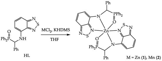 Reactions between MCl2 (M = Zn and Mn) and the proligand HL in the presence of potassium trimethylsililamide (KHDMS) as a base in THF afforded the corresponding complexes [ML2] (1 and 2, correspondingly; Scheme 1). In the case of 1, the reaction easily proceeded at room temperature, while in 2, we refluxed the mixture to involve all the amount of relatively poorly soluble MnCl2 in the reaction. The complexes were precipitated from the mother liquor as solvates 1·THF and 2·THF. The formation of the compounds with similar yet distinctive features of the crystal structures (see the discussion below) can be governed by the different temperatures of the reaction/crystallization or by some effects of the metal, e.g., seed effects of MnCl2. The latter is known to form polynuclear moderately soluble species with THF of the general formula [MnCl2(THF)x] [40], which could temporarily crystallize as intermediate products in the course of the reaction. Interestingly, the subsequent extraction of solid 2·THF with a portion of THF afforded another crystalline solvate, 2·2THF. This also implies that the minor changes in the crystallization conditions affect the formation of one or another crystalline phase.
