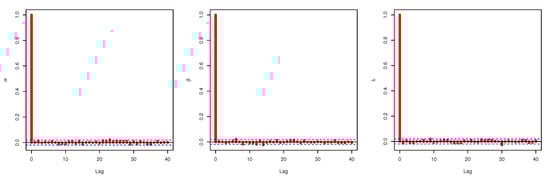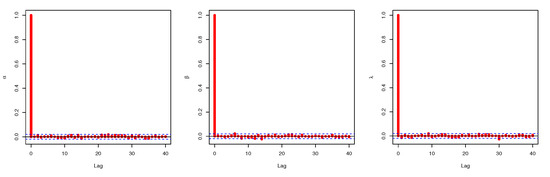 Figure 3, Figure 5, and Figure 6 confirm that the MCMC trace has normal results and convergence measures for data set I. Furthermore, this shows the histograms for the marginal posterior density estimates of the parameters based on 5000 chain values and the Gaussian kernel. The estimation in Figure 5 clearly indicates that all generated posteriors are symmetric with respect to the theoretical posterior density function. Figure 4 explores the auto-correlation test which revealed that the auto-correlation test for the MCMC is the correlation between an iteration series with a decreased version of itself. The auto-correlation function started to slow down at zero, which represents the correlation of the iteration series with itself, and then, it resulted in a correlation of one.