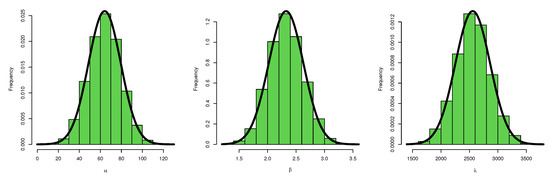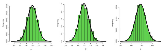 The conditional posteriors of and in Equations (26)–(28) thus do not have normal forms. As a result, the MCMC method will be used to compute the Bayesian estimates of and in addition to the Bayesian estimates of the survival function and hazard function as well as the related credible intervals. See Robert [23,24] for a detailed description of the MCMC method.