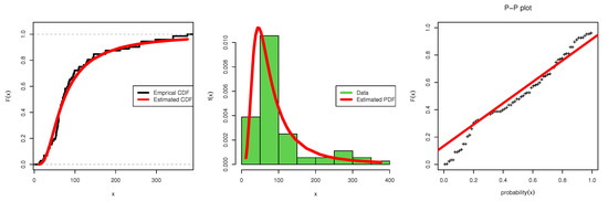 Estimated CDF, pdf and pp-plot: data set II.