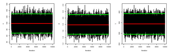 MCMC is developed to create samples of the joint posterior function in Equation (18). The MCMC mechanism is primarily concerned with calculating an estimated integral value. We consider the Gibbs in the Metropolis–Hasting sampler approach in order to implement the MCMC technique. From Equations (5) and (17), the joint posterior distribution can be written as