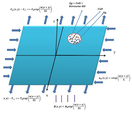 Consider a steady, bidirectional and incompressible flow of a hybrid nanofluid (Ag+CuO+kerosene oil) over an extendable surface. The geometry of the problem was chosen in the Cartesian coordinate system, centered at , as can be seen in Figure 1[50]. The geometry of the problem was chosen in such away that the and velocities act along the x- and y-axis, respectively. The wall temperature and concentration of the hybrid nanoparticles were assumed in the exponential forms and , respectively. A variable magnetic field was applied perpendicular to the surface, where shows the strength of the applied magnetic field. The fluid is electrically conductive, in which the induced current produced was considered in the nanofluid fluid flow. Moreover, the heat and mass transfer were investigated through the double-diffusion Cattaneo–Christov theory, which acts as a generalization of the famous Fourier and Fick laws [47,50]: