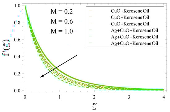 The dependence of both nanofluids’ dynamics on the varying magnetic field strength M is displayed in Figure 3. The graph shows that the increasing magnetic field strength M results in a reduction in the profile. The values of M were taken to be . The drop in is more prominent at the intermediate values of . The spacing between different curves decreases with the increasing values of M. The increasing M values causes to reduce at a greater rate in the hybrid nanofluid compared to the ordinary nanofluid. This shows that the increasing M values result in a reduction of the fluid velocity distribution.