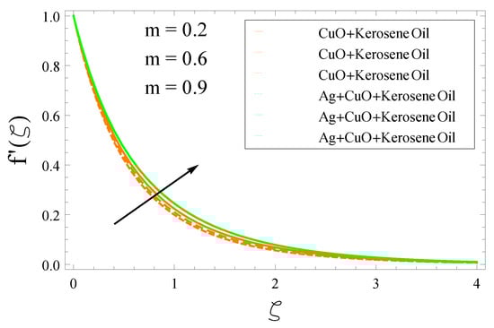 The dependence of on the Hall effect parameter m is depicted in Figure 4. The chosen values of m were . The graph shows that the increasing values of m increase the profile of for both types of nanofluid. The increase is more prominent at the middle values of . The increase in the hybrid nanofluid is the largest one for the highest of m, that is at . This shows that the increasing Hall effect strength results an increase in the velocity distribution of both types of nanofluid.
