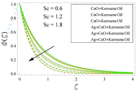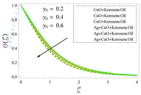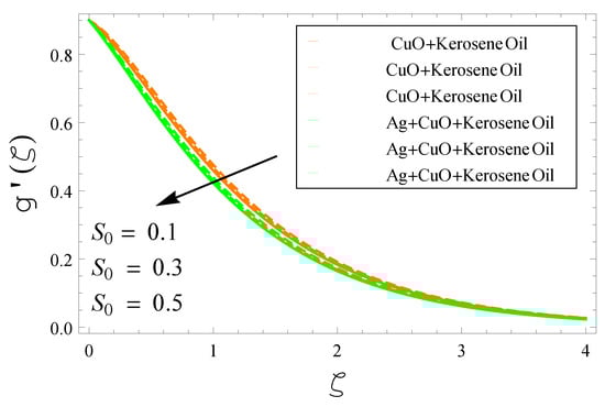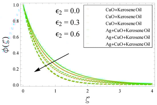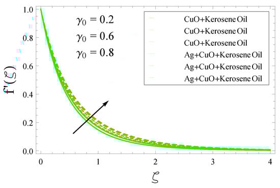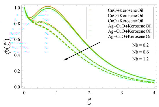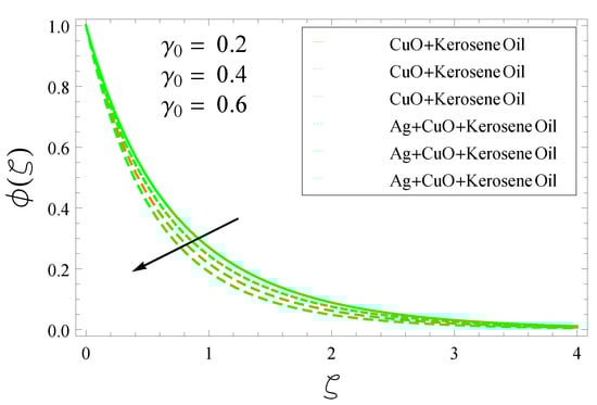 The impact of the mass flux in the velocity of the considered nanofluid (CuO+kerosene oil) and the hybrid nanofluid (Ag+CuO+kerosene oil) is depicted in Figure 2. The values of were taken to be . The graph displays a decreasing dependence of the fluid velocity with increasing . Both fluids exhibit almost the same dependence. Thus, the increasing causes a lower distribution in .