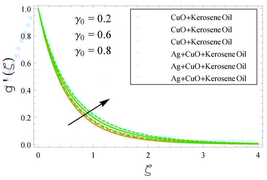 The impacts of the mass flux parameter and stretching ratio on the other component of the velocity are respectively exhibited in Figure 6 and Figure 7. The chosen values of were , and those of were . It is clear from Figure 6 that the increasing mass flux causes the velocity distribution to reduce along the vertical direction. The drop is more drastic for the hybrid nanofluid compared to the simple nanofluid. The increasing stretching ratio strength causes the velocity distribution to increase along the vertical direction, as displayed in Figure 7. The increase in the velocity distribution is more prominent for the hybrid nanofluid compared to the ordinary nanofluid. The spacing between different curves changes with the higher values of at the intermediate values of .