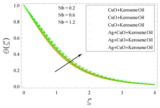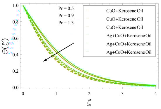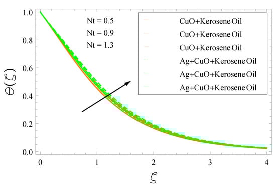 The dependence of the chosen simple and hybrid nanofluids temperature on Prandtl number and thermophoresis parameter is respectively plotted in Figure 8 and Figure 9. The values of both parameters were chosen to be . The temperature of both fluids drops with the increasing values of . This is due to the thermal diffusion, because it has an inverse relation with . On the other hand, when the viscous diffusion increases, the Prandtl number jumps up. As a result, the temperature profile decreases. The temperature drop shows a complex dependence on the increasing . At a smaller value of , the simple nanofluid temperature drops at a higher rate compared to the hybrid nanofluid temperature drop. At higher values, the temperature drop decreases compared to the smaller separation between the different curves. Thus, the smaller thermal diffusivity associated with a higher results in a decrease in the temperature distribution of both types of fluid. Figure 9 shows that the changing thermophoresiscauses the temperature of the fluids to increase. The increasing nature of the fluids’ temperature with the increasing is higher for the hybrid nanofluid compared to the single-component nanofluid.