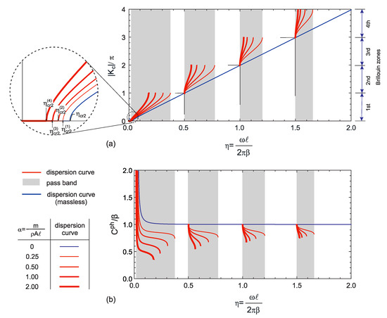 Figure 8b. These waves propagate only for the frequencies in the pass bands, and the phase velocity changes depending on the frequency and mass ratio. The effect of the lumped masses on the phase velocity in the frequency-dependent pass bands or how they lead to dispersion is observed here. For a nonzero mass ratio (
