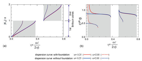 Figure 9a,b). At high frequencies, the effect of the presence of the elastic foundation on dispersion decreases. This low frequency band gap can be associated with the dynamic properties of elastic metamaterials using elastic resonators, and additionally, these findings are in line with the literature [
