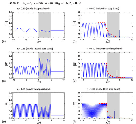 Figure 12a,c,e). While the low-frequency incident wave was transmitted almost as it was, although amplitudes increased inside the barrier at high frequencies, the displacements had much less amplitude than 1 when they passed the barrier. For the frequency values selected in the first three stop bands, the amplitudes quickly went to zero when they passed the barrier (