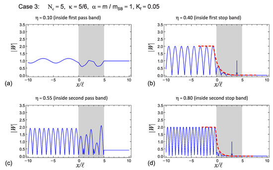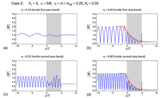 Figure 14a,c). Although the amplitudes increased inside the barrier at high frequencies in the pass band, it was observed that the displacements had an amplitude much less than 0.5 when they passed the barrier. For the frequency values selected in the first two stop bands, it was found that the amplitudes quickly went to zero inside the barrier (
