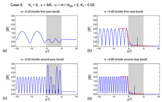 Figure 13b,d). For the “lighter mass” case, the displacement amplitude in the first two stop bands approached or became zero, respectively, at the end of the barrier. It was observed that the effect of the masses was relatively less compared to the “normal state”.