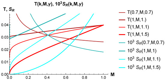 The plot shows the dependence of the temperature T (red), the entropy (blue), the free energy G(green) and the radiation entropy S (cyan) on M for functions with different scaling parameter k and . Plots in light tones correspond to parameters describing dependencies with at . Darker tones correspond to increasing temperature at , or (thick darker red line, ).