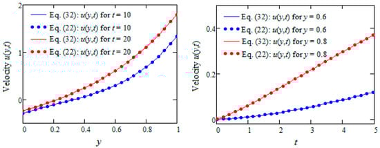 The velocity field given by Equation (32) clearly satisfies the initial condition (18). Direct computations show that the boundary conditions (19) are also satisfied. For its correctness validation, Figure 1 has been prepared when y varies between with fixed values of t and t varies between with fixed values of y, respectively, to show that the diagrams of the dimensionless velocity field corresponding to and are identical to those obtained by the numerical inversion of the Laplace transform given by Equation (22). Here is the Heaviside unit step function.