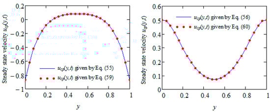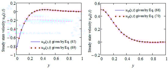 where the constant . The equivalence of the present solutions given by Equations (55) and (56) to those from Equations (59) and (60), respectively, is graphically proven by Figure 2.