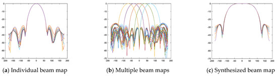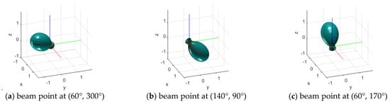 The rotationally symmetric beamformer contains two parts: beam guidance and beam synthesis. The weighted value adjusts the beam map shape and the spherical harmonics adjust the beam steering angle. The rotationally symmetric beamformer with beam weight of Section 3.3 and different beam points is shown in Figure 3.