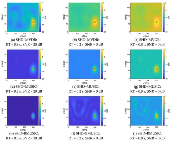 To verify the performance of the SHD-BMUSIC algorithm in the reverberation-noise sound field, we considered the positioning results under different reverberation durations and SNR levels. There were five sources emitting simultaneously, and the source locations were (60°, 300°), (140°, 90°), (60°, 170°), (140°, 250°), and (60°, 30°). There were 25 beams used to form five new separate beams to the source area and to cover the target area. The spatial spectra of SHD-BMUSIC at different SNRs and RTs are shown in Figure 7.