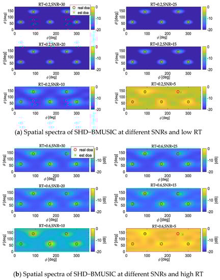 The signals received of the sphere array were obtained by convolving the original audio with the RIRs and by adding a certain SNR of Gaussian white noise. The signals received were transformed to the time–frequency domain using the short-time Fourier transform (STFT). The frame length of STFT was 16 ms, and the selected window function was a Hamming window with a window length of 256 points and a frame overlap of 50%. Then, we carried out a spherical harmonic transform in the used frequency band. A disadvantage of rigid spherical arrays is the low-frequency performance, so excessive noise amplification at lower frequencies due to modal strength compensation needs to be avoided [29]. According to the spatial aliasing , the upper-frequency limit is around 5 kHz. Thirty frequency bins ranging from 2700 Hz to 3600 Hz were used to perform the spherical harmonic transform to obtain the SHD sound pressure data. Finally, DOA estimation algorithms were executed separately to obtain the DOAs of the sound sources. The azimuthal accuracy and elevation angle accuracy of the spectrum peak search were 1 degree. The localization performances of the SHD-MUSIC and SHD-BMUSIC are compared in these different SNR levels and reverberation time (RT) environments.