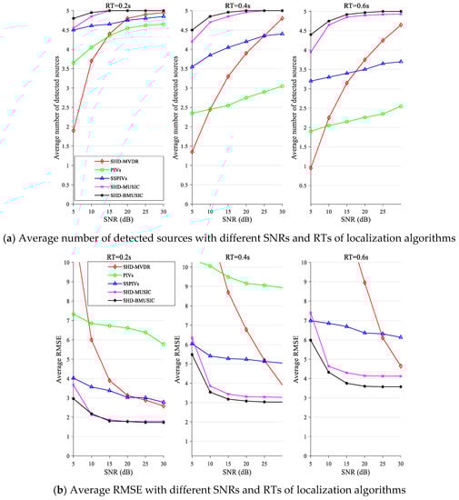 The statistical results of SHD-MVDR, PIVs [29], SSPIVs [29], SHD-MUSIC, and SHD-BMUSIC algorithms were compared for multi-source case testing. Figure 8 shows the average results of the tests with five sources for each combination of SNR and RT.