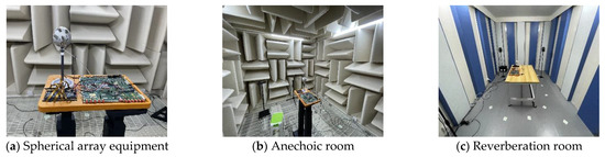 The spherical microphone equipment was used to collect the recording data in a standard anechoic and reverberant room. Each audio segment was recorded for 4 s and the rest of the parameter settings were the same as the simulation parameter settings. The actual spherical microphone array we used and the actual experimental room for field testing are shown in Figure 9.