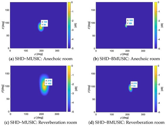 Finally, it is promising to conclude that both algorithms are better at estimating the location of a single source in an anechoic room. The SHD-BMUSIC had sharper peaks and lower estimation errors. In the reverberation room, SHD-MUSIC showed additional excess peaks due to reverberant reflected sound in adjacent dual-source experiments. This made it easy for the algorithm to mistake the pseudo-peaks for the direction of the sound source, leading to an incorrect estimation of the sound source location. However, SHD-BMUSIC did not have the phenomenon of redundant pseudo-peaks. This was because the beamforming suppressed the excess reflected sound outside the source region, thus improving the reverberation resistance of the algorithm.