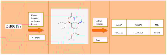 Our primary data source in this study is the DrugBank Database. It is a comprehensive, freely accessible, online database containing information on drugs and targets. The latest release of DrugBank [] contains 13,431 drug entries, including 2617 approved small molecule drugs, and 1345 approved biotech (protein/peptide) drugs. DrugBank data are indexed by DrugBank Identification Numbers, where a query returns the representation of a related item in the so-called Canonical SMILES (SMI) format [], for most, but not all, entries. Filtering out the entries with no SMI representation left us with 5771 drugs. SMI representations cannot be readily used as an input vector to an autoencoder. Therefore, we employed the Rcpi (Molecular Informatics Toolkit for Compound-Protein Interaction in Drug Discovery) [] library in R-studio to perform the necessary conversions. We used eight feature descriptors to extract drug features, namely, Drug Amino Acid Count (20 features), Drug ALOGP (3 features), Drug Atom Count (1 feature), Drug Aromatic Atoms Count (1 feature), Drug Apol (1 feature), Drug Autocorrelation Charge (5 features), Drug Autocorrelation Mass (5 features), and Drug Autocorrelation Polarizability (5 features). Consequently, each one of the 5771 drugs at our disposal has a representation by 41 features (Figure 2).