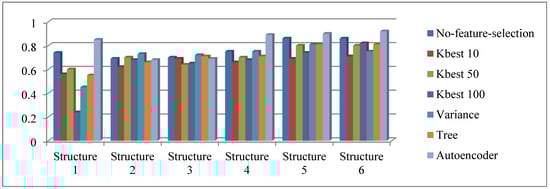 We summarize the accuracy and F-score values for all feature selection methods and for all structures in Table 10, where the bold values represent the best accuracy and the underlined values represent the second-best accuracy values amongst the methods under each structure.