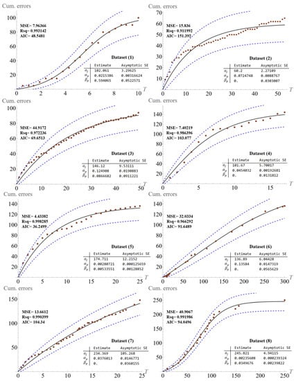 In general, decision makers will investigate whether the suggested model is capable of fitting the datasets using a variety of patterns. Figure 1 depicts the relevant results of discrepancies between the predicted data and the actual data of cumulative errors. These differences are calculated using the LSE approach, which is applied to all eight datasets to determine the parameters of the proposed model. In Figure 1, the estimated value and the asymptotic standard error of the model parameters have been provided in the subplots. We can see that the subplots for datasets (1) and (8) present an S-shaped pattern; this should be the phenomenon of the learning effect in debugging work. In the two datasets, we can find the learning factor (0.5941, 0.0350) is larger than the autonomous errors-detected factor (0.0215, 0.0024). This indicates that the efficiency of debugging work arises in the middle to later stage of the software test due to the staff’s learning effect. However, the estimation error of the parameters always exists and cannot be avoided. Therefore, the decision makers need to reasonably infer the confidence intervals of the model parameters if they want to use a conservative strategy. The asymptotic standard error can help us to infer the confidence intervals of the model parameters by using Equation (25). The confidence intervals (95%) of the mean value function suggested by Yamada and Osaki are drawn as blue dashed lines. According to Equation (26), it can be seen that the space between blue dashed lines is increased with testing time since the standard deviation of the mean value function is positively correlated with testing time. Moreover, after the analysis of Goodness-of-Fit, it can be seen that the proposed model mostly outperforms in the criteria of MSE, R-squared, and AIC. All the fitting results are fairly good for the proposed model, and the values of R-squared are greater than 0.95 except for the subplot of dataset (2). Accordingly, the proposed model can be applied in further works due to its superior prediction ability.