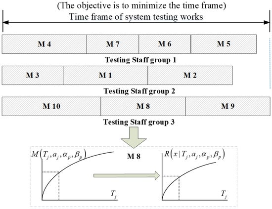 Furthermore, suppose the technology company decided to develop software systems using modular programming instead of traditional system development. Therefore, the whole EDA system can be divided into the four subsystems and the fifteen related software modules. Figure 7 illustrates that each subsystem can utilize some software modules in series-parallel relations. The correspondence between the subsystem and the software modules can be tabulated as a matrix. The bottom half of Figure 7 gives the matrices of , , and for illustrating the structures of subsystems and modules. The initial potential software errors of each subsystem have been estimated by senior engineers and are presented at the bottom of matrix . Moreover, in this figure, it can be seen that the common and shared modules M5, M7, M9, and M14 can be used in different subsystems. Therefore, such a common and shared module’s reliability will influence more than one subsystem’s reliability. Similar to the previous issue, the software testing phase will begin after fourteen months of software development. Instead, the manager adopts the modular testing strategy for the EDA system in parallel. At present, according to the company’s human resources, three software testing and debugging groups can be assigned to the testing and debugging work for 8 h per day. The model parameters ( and ) of each testing and debugging group can be estimated according to the historical testing data. Furthermore, due to the different testing and debugging efficiency for each group, the related costs must be different. The above information can be seen in Table 5. Moreover, each subsystem has its minimal reliability requirement, and the manager must fulfill the basic requirement of clients. The risk costs of each subsystem are estimated to be USD 140,000, USD 180,000, USD 190,000, and USD 210,000, individually. It should be noted that the reliability calculation is based on no error occurring within a defined operation time. Finally, the manager is required to shorten the length of the testing project, and therefore the upper limit of the testing time frame is set to 45 days. The detailed information can be seen in Table 6.
