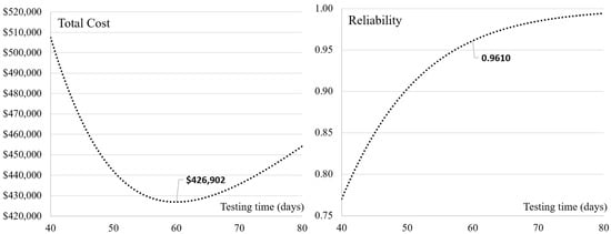 Following the completion of the calculation utilizing the proposed model, the curve of the expected testing cost of the project presents convexity with testing time, as can be seen in Figure 5 and Table 4. In order to meet the minimal requirement of software reliability (), the testing time should be set to 58 days or later (). However, the time point () is not the optimal solution for the company since the expected testing cost (USD 427,362) of the time point is still higher than that of the next day (USD 427,010). Therefore, the managers should set the testing time to 60 days after the testing project begins, and the expected testing cost will decline to USD 426,902 with the software reliability 0.9610. The benefit of extending the testing time for increasing reliability can cover the loss of other growing costs. Additionally, it can be seen that the detection rate is relatively stable with testing time because the value of the learning factor is very low and most testing staff cannot effectively increase debugging efficiency from their experience in the past.