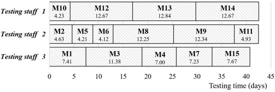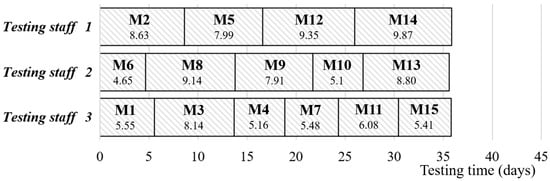 Suppose the manager of the company would like to know how to schedule the testing work in order to get the shortest time frame for the EDA system testing. Therefore, the manager can apply Model 1 of Section 3.2 in dealing with the problem. After the calculation using Model 1, we can get the optimal solution of the software test scheduling. Figure 8 and Table 7 present the Gantt chart and the detailed computation results of the software test scheduling by applying Model 1. In this figure, we can see that the manager should assign modules M2, M5, M12, and M14 to staff group 1, modules M6, M8, M9, M10, and M13 to staff group 2, and modules M1, M3, M4, M7, M11, and M15 to staff group 3. The testing time can be shortened to 35.83 days. However, the averaged reliability of the whole system will be down to 0.9125 (Reliability of subsystem: = 0.95, = 0.90, = 0.90, = 0.90), and the total cost will be estimated at USD 328,935. Although Model 1 can effectively shorten the testing time of the project, the averaged system reliability is relatively low, and the testing cost needs to reach the optimum. Accordingly, Model 1 is only appropriate for a software development project that needs to be released as soon as possible.