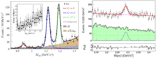 - Ablikim, M.; Achasov, M.N.; Adlarson, P.; Albrecht, M.; Aliberti, R.; Amoroso, A.; An, M.R.; An, Q.; Bai, Y.; Bakina, O.; et al. Observations of the Cabibbo-Suppressed decays → nπ+π0, nπ+π−π+ and the Cabibbo-Favored decay →nK−π+π+. arXiv 2022, arXiv:2210.03375. [Google Scholar]