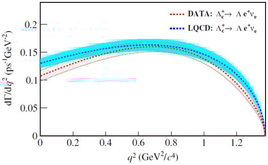 Comparison of the differential decay rates of with LQCD predictions. The band shows the total uncertainties.