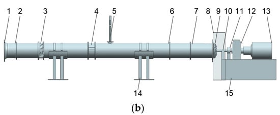 Fan performance test rig. (a) Physical drawing of test rig. (b) Structural diagram, where: 1, inlet; 2, inlet differential pressure measuring hole; 3, flow control valve; 4, rectifying grid; 5, anemometer propulsion device; 6, static pressure measuring hole; 7, conical connecting pipe; 8, protective cover; 9, test fan; 10, connecting shaft; 11, torque meter; 12, high-speed gearbox; 13, AC variable frequency motor; 14, fan support; 15, motor base.
