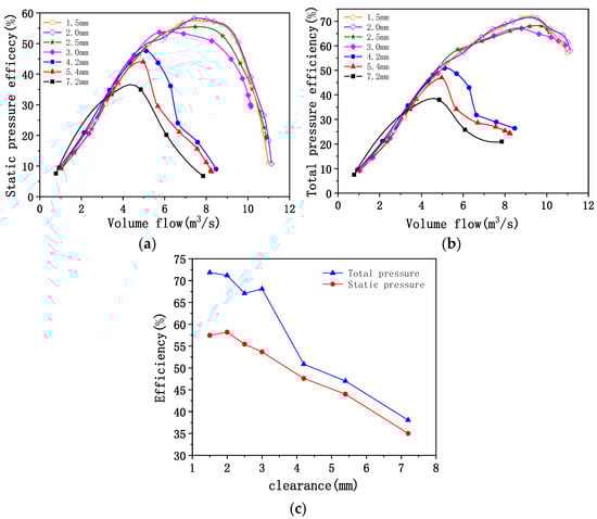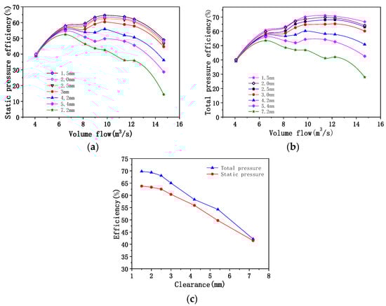 Comparison of efficiency under different clearances: (a) comparison of static pressure efficiency under different clearances; (b) Comparison of total pressure efficiency under different clearances; (c) comparison of peak efficiency under different clearances.